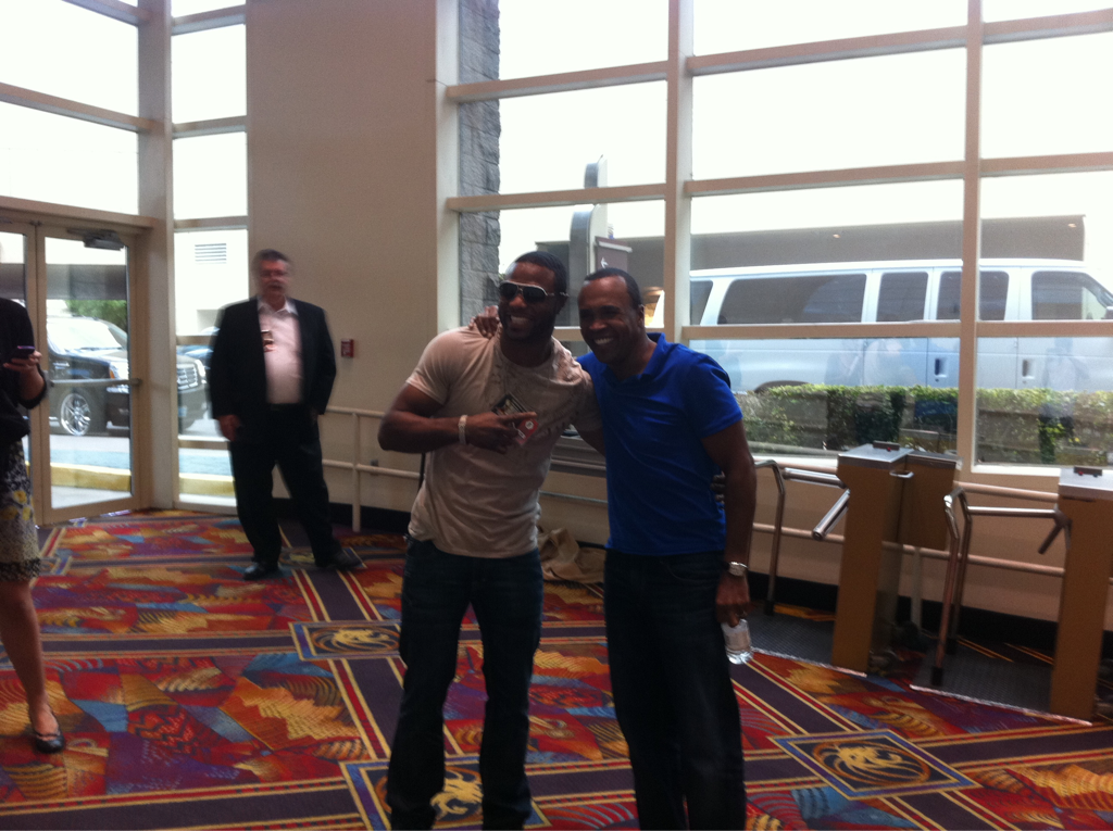 We just caught up with former light heavyweight champ Jean Pascal (left with Sugar Ray Leonard) at the MGM Grand. Pascal is still searching for a foe in his first fight since losing his Ring belt in a rematch with Bernard Hopkins. One prospective opponent is Kazakh alphabet titlist Beibut Shumenov, who Pascal called out after his last fight. But Pascal told Stiff Jab the two sides haven’t been able to agree on a venue.